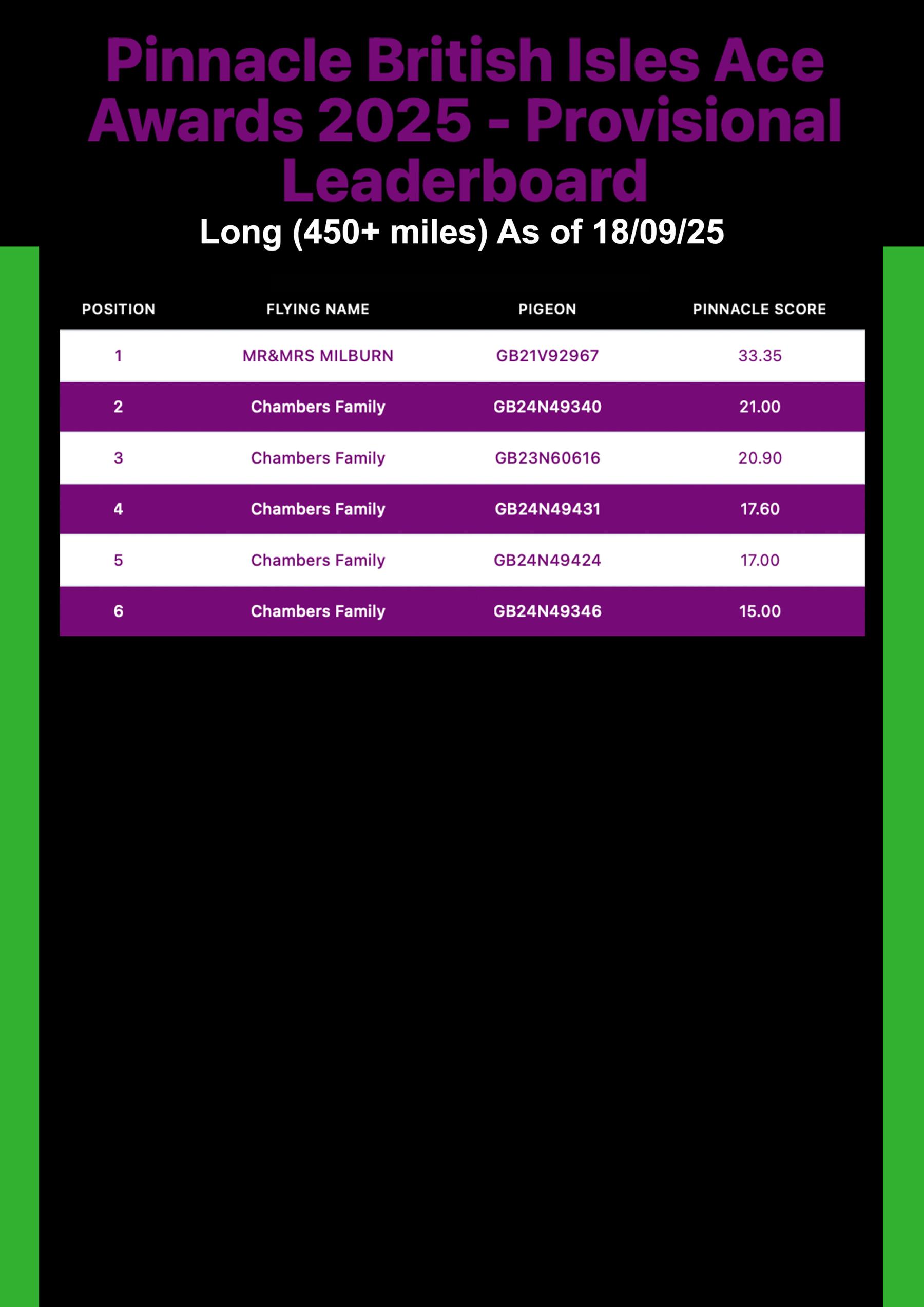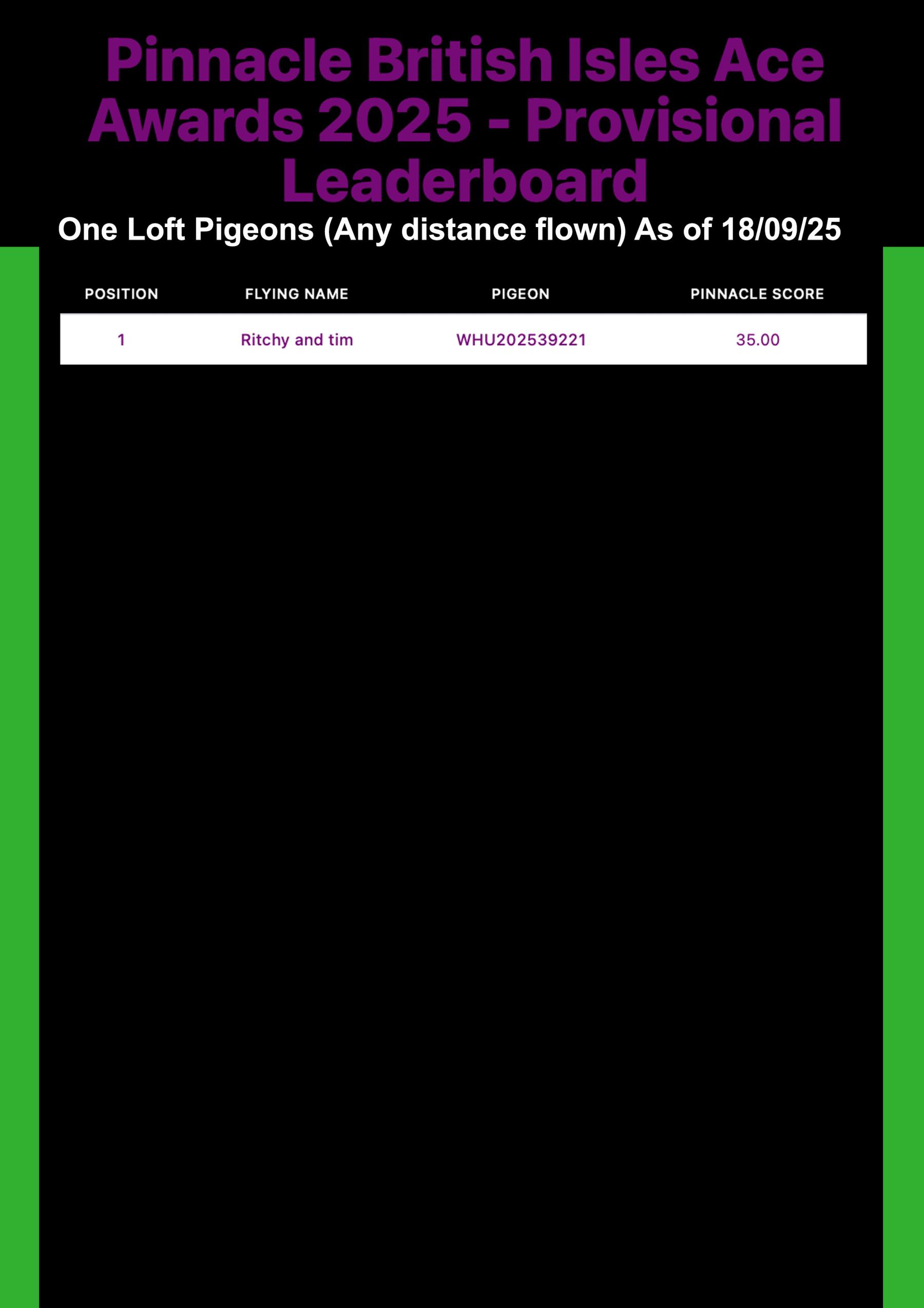For British Isles Ace Pinnacle ‘One Loft Pigeons’ (Any Distance Flown) Current Year Rung 2025 - Maximum of 3 Best Individual Performances submitted