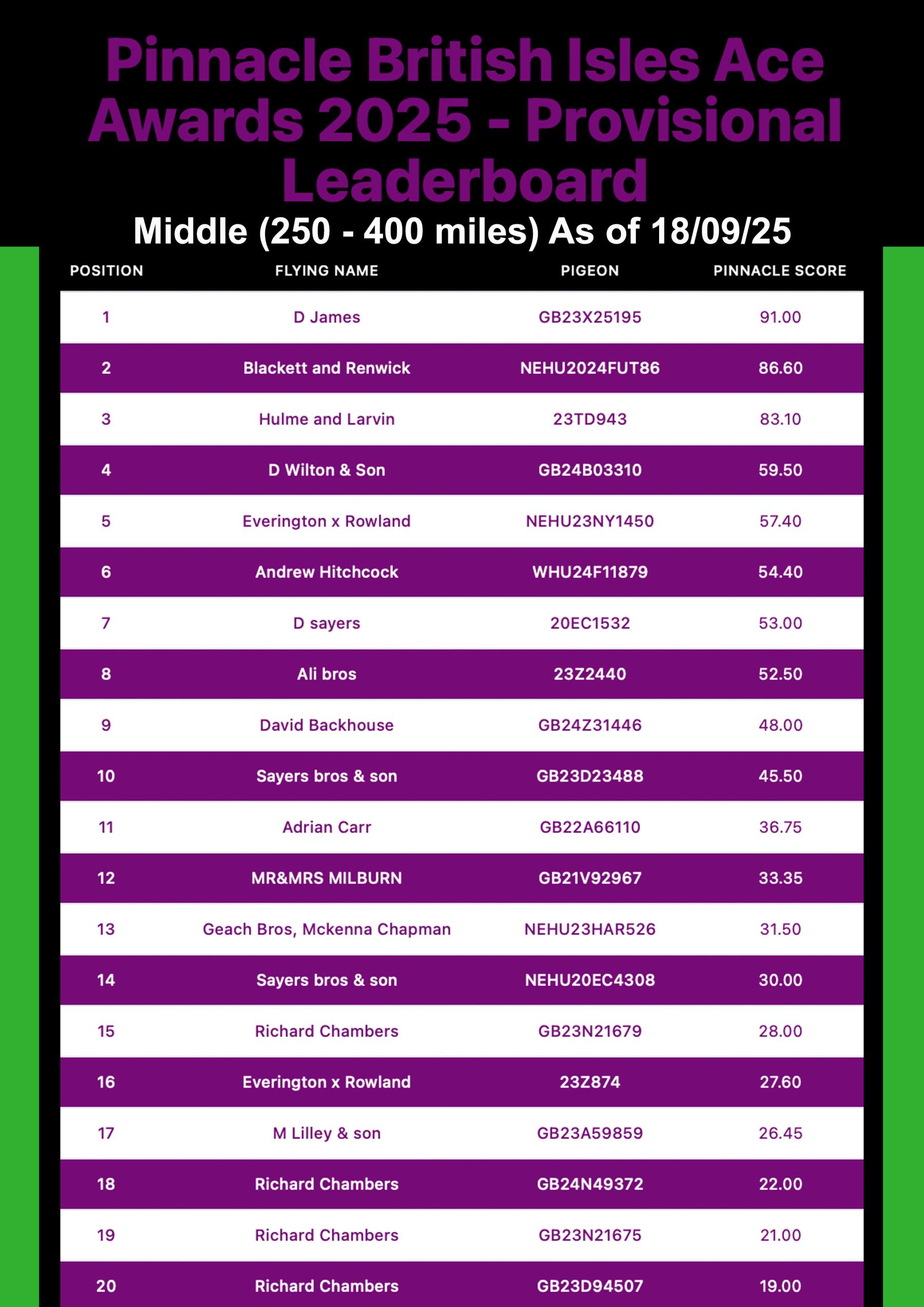 For British Isles Ace Pinnacle ‘Middle’ (250-450 Miles) Old Bird - Maximum of 3 Best Individual Performances submitted