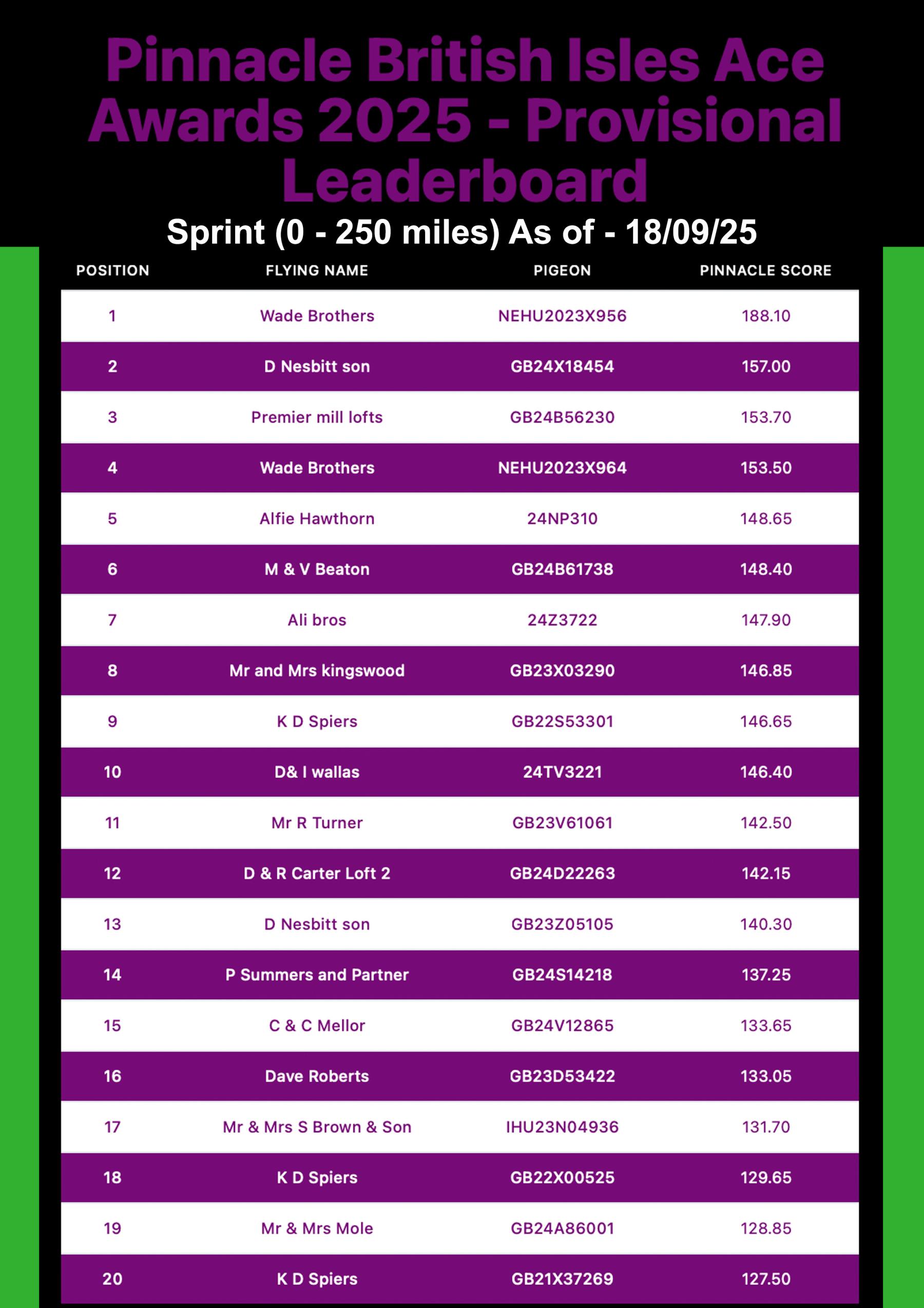 For British Isles Ace Pinnacle ‘Sprint’ (0-250 Miles) Old Bird - Maximum of 4 Best Individual Performances submitted