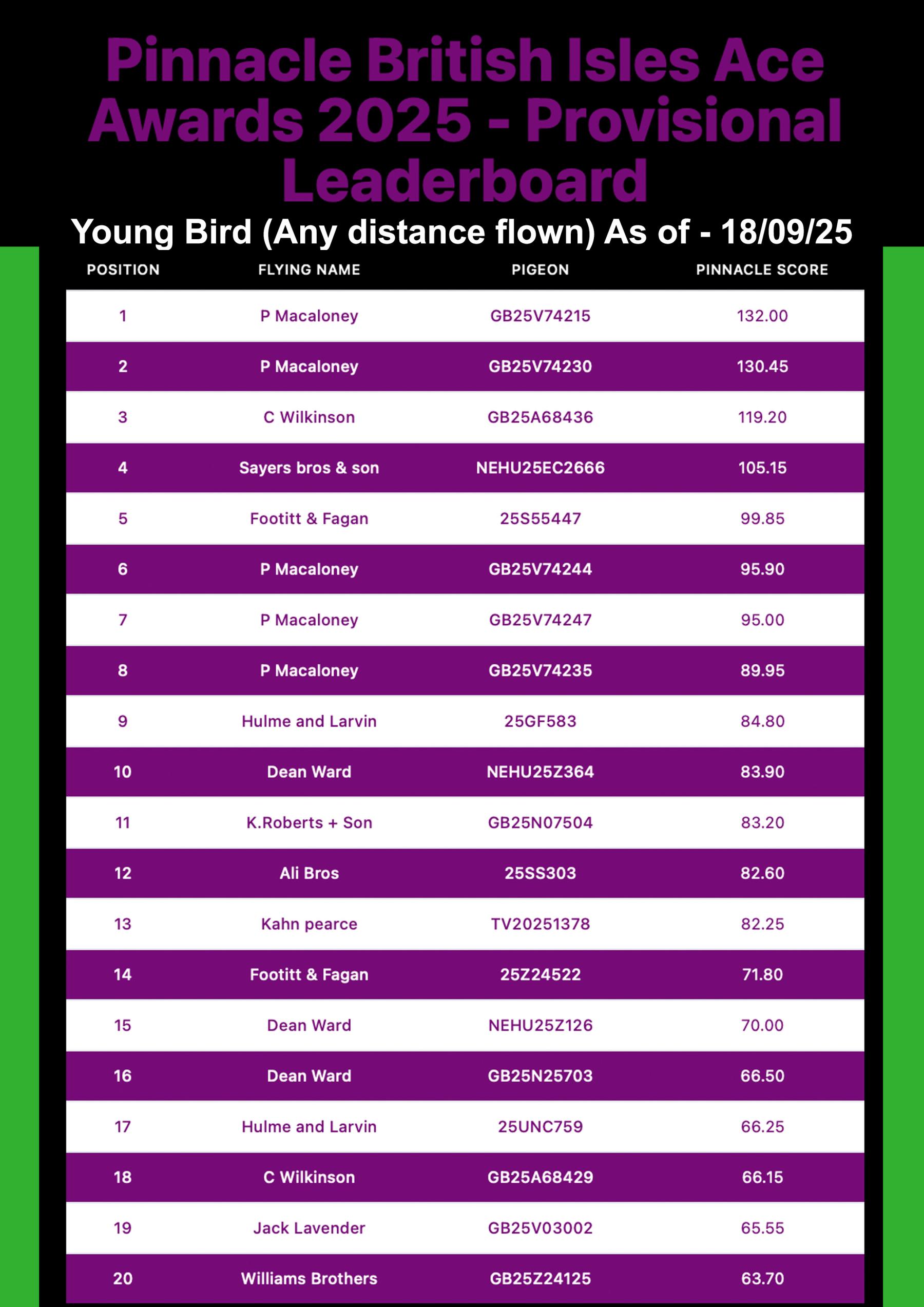 For British Isles Ace Pinnacle ‘Young Bird’ (Any Distance Flown) Current Year Rung 2025 - Maximum of 3 Best Individual Performances submitted